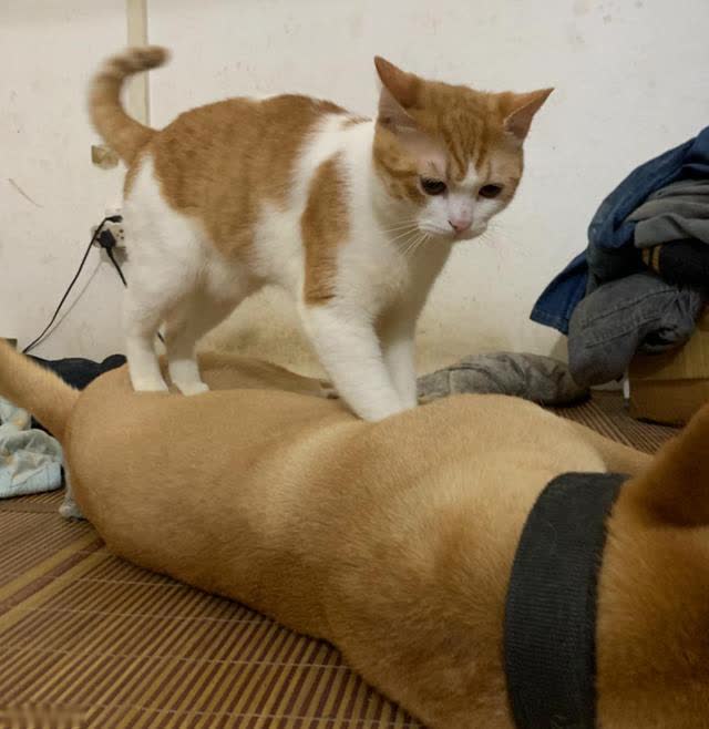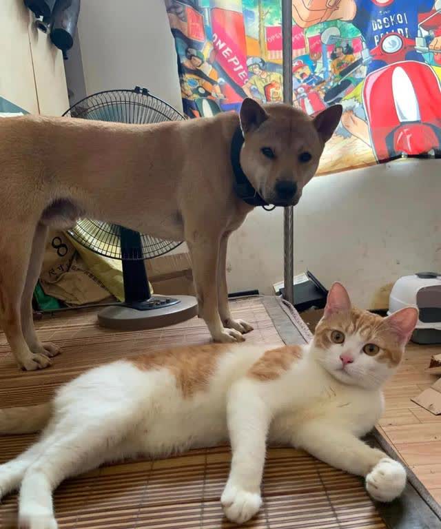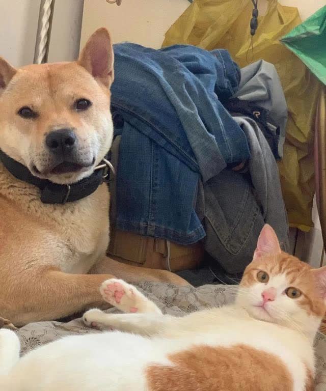 在广西工作的网友@冯国峰原本养了只帅气的狗狗,叫可可,但去年中秋又偶遇了一只小橘猫,从此家里就更热闹了!