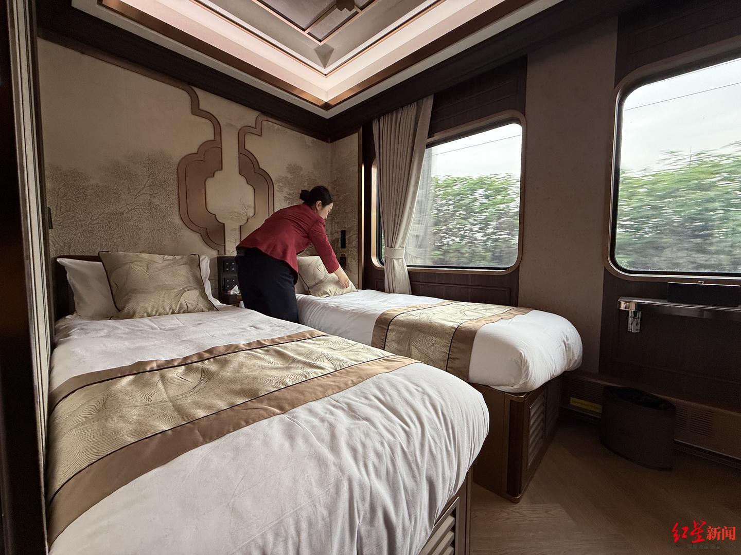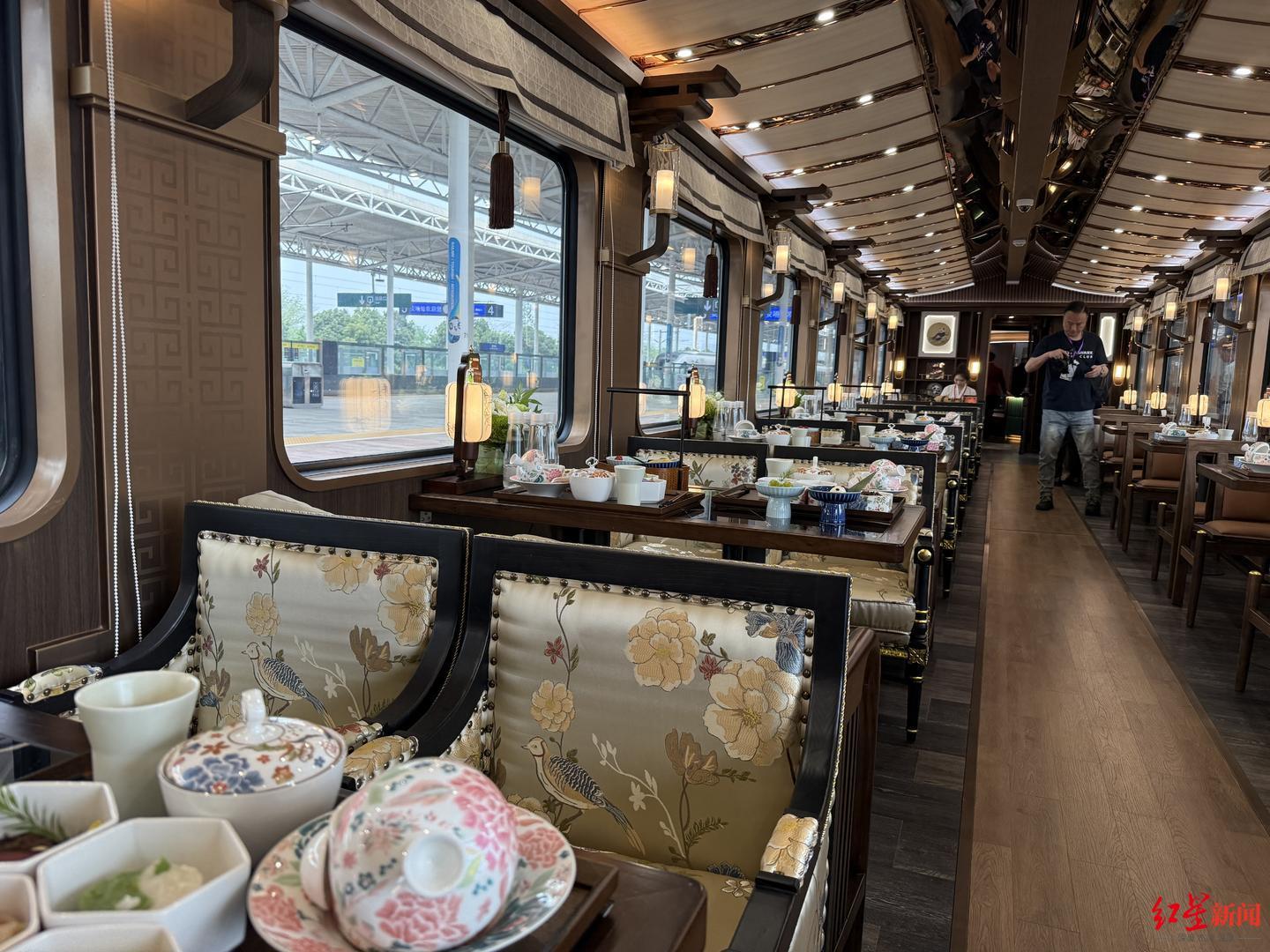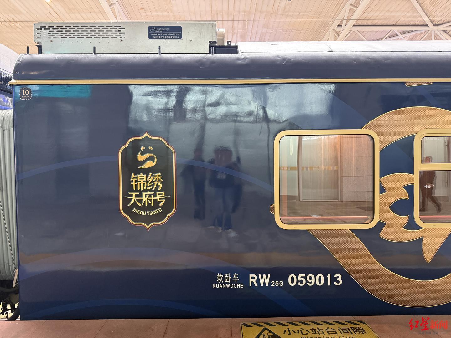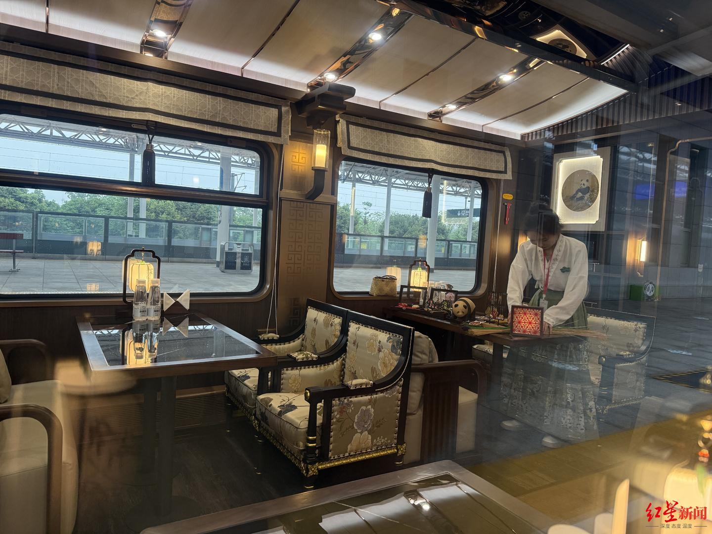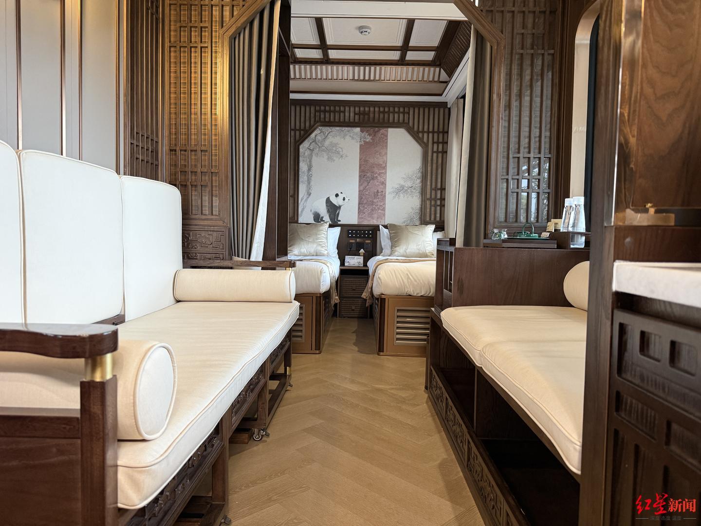 上午8时许,记者在站台上看到了这趟充满东方美学魅力的“锦绣天府号”熊猫专列,列车共设18节车厢,包含46间客房,仅设置92个席位,在空间规划上兼顾了私密性与体验感。整车以宋代美学为骨、巴蜀文化为魂,从车厢内饰的蜀锦纹样、宋式软装陈设,到细节处的非遗手作陈列,处处都藏着中式美学的巧思。