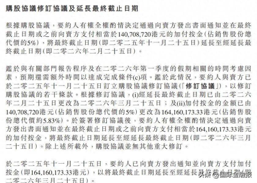 11月25日晚间,香港耀才证券公告称,考虑到与有关部门的报告程序及2026年一季度的假期因素,预计还需要更多时间来完成向国家发展改革委的申报。因此,要约人与卖方在当天修订了购股协议的若干条款,包括将最终截止日期延长至2026年3月25日,并将加付按金从1.4亿港元提升至1.64亿港元。
