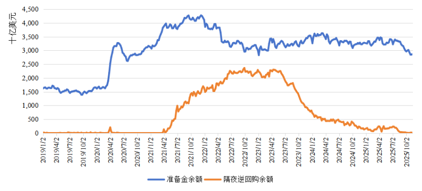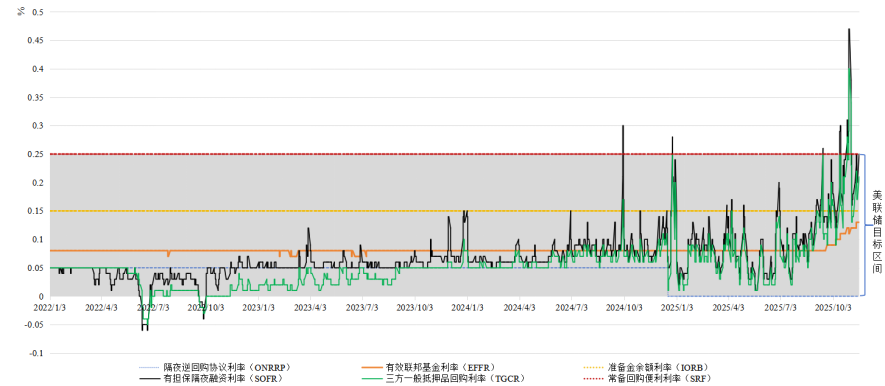 自2022年5月开始,美联储决定开始缩表,缩表结束的条件则是准备金回落至略高于充足状态的水平。2024年5月,美联储决定减缓缩表节奏,并在2025年5月起进一步减缓缩表。从2022年下半年至2025年三季度,准备金余额在3万亿美元至3.5万亿美元区间波动,直至近期跌至2.9万亿美元以下。随着准备金从极度充裕回落至充足水平,美国货币市场利率对准备金变动的敏感性增强,货币市场条件逐步收紧,月末和季末回购利率波动性增加。隔夜逆回购余额则从2022年下半年的2到2.3万亿美元回落至目前的不足百亿美元的水平。同时,美国财政部一般账户余额在债务上限问题解决前有所下行,而在债务上限问题解决后回升至2022年以来高点附近,导致货币市场流动性进一步收紧。