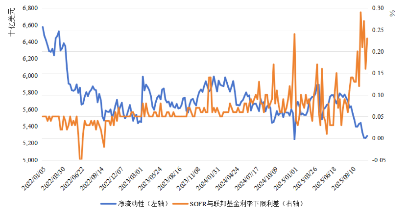 图5:美元净流动性和SOFR与联邦基金利率下限利差