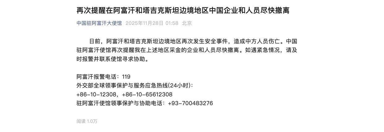 此外,中国驻阿富汗使馆也再次提醒我在上述地区采金的企业和人员尽快撤离。如遇紧急情况,请及时报警并联系使馆寻求协助。
